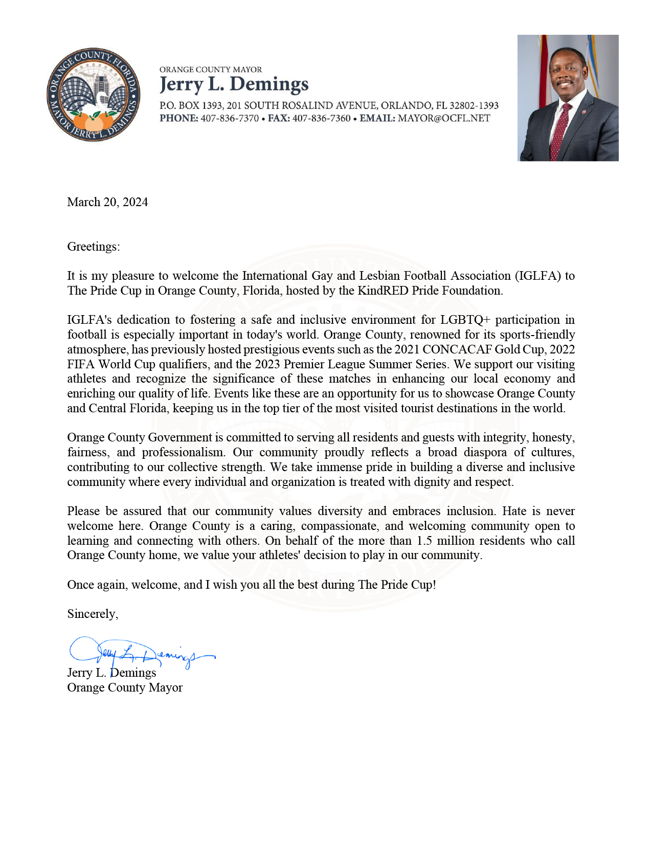 It is my pleasure to welcome the International Gay and Lesbian Football Association (IGLFA) to The Pride Cup in Orange County, Florida, hosted by the KindRED Pride Foundation.